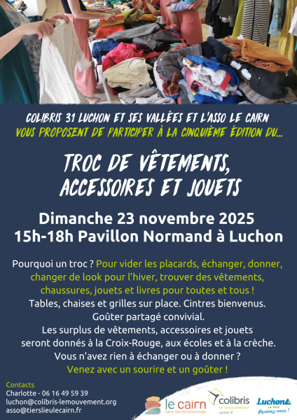 Le groupe local Colibris 31 Luchon et ses vallées et l'Asso Le Cairn vous proposent de participer à la deuxième édition du troc de vêtements, accessoires et jouets.